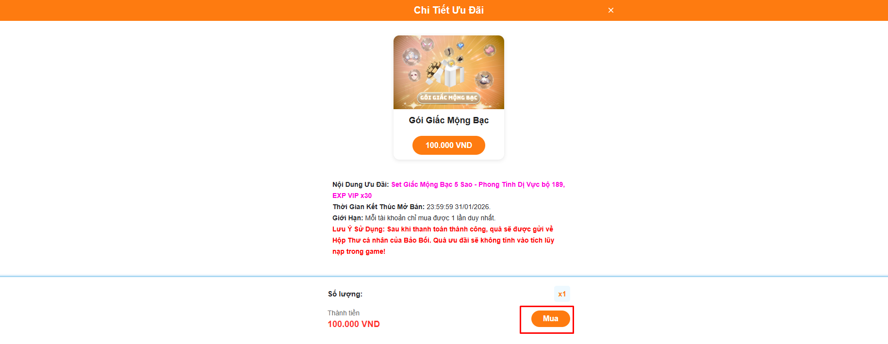 - Sau khi chọn gói và thanh toán xong. Hệ thống sẽ tự động chuyển Gói Quà Ưu Đãi về đúng nhân vật và máy chủ đã chọn trước đó.