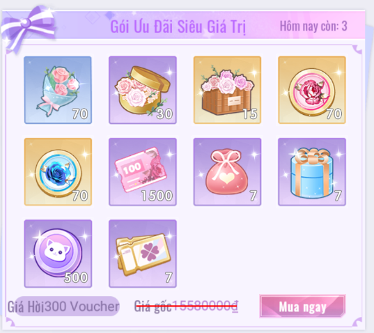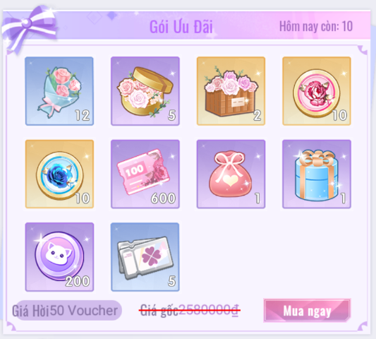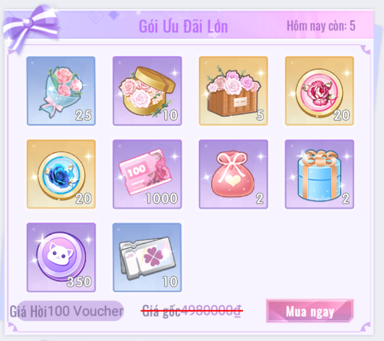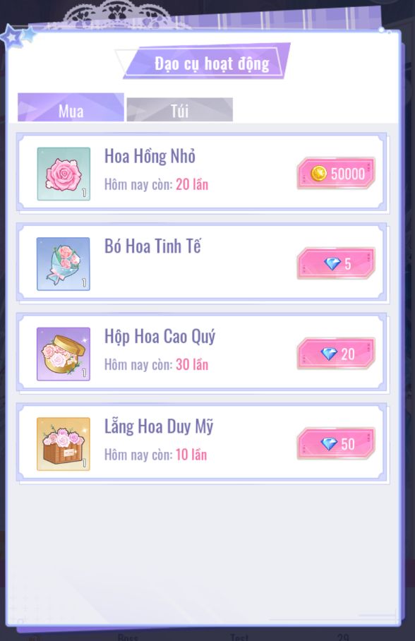 - Giới Hạn 20 lượt mua mỗi ngày. 50 [Kim Cương] = 1 [Lẵng Hoa Duy Mỹ].