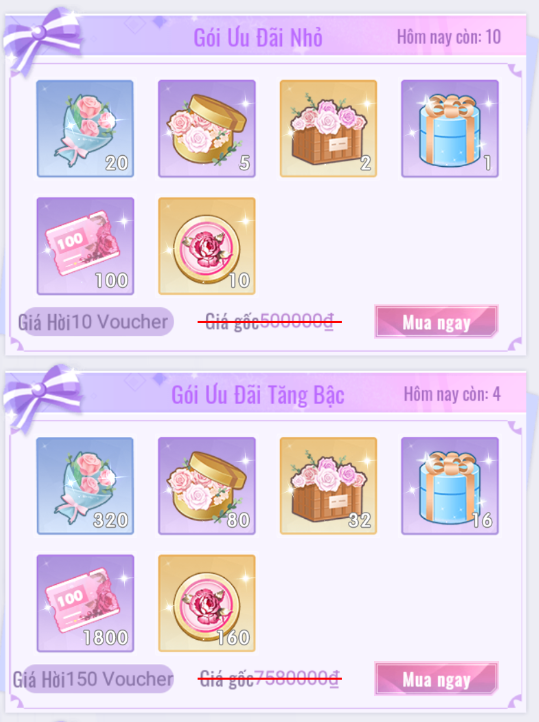 - Giới Hạn 20 lượt mua mỗi ngày. 50.000 [Vàng] = 1 [Hoa Hồng Nhỏ].