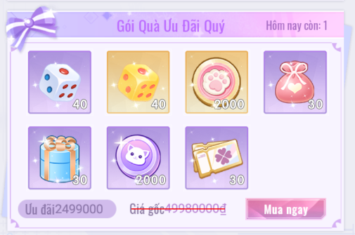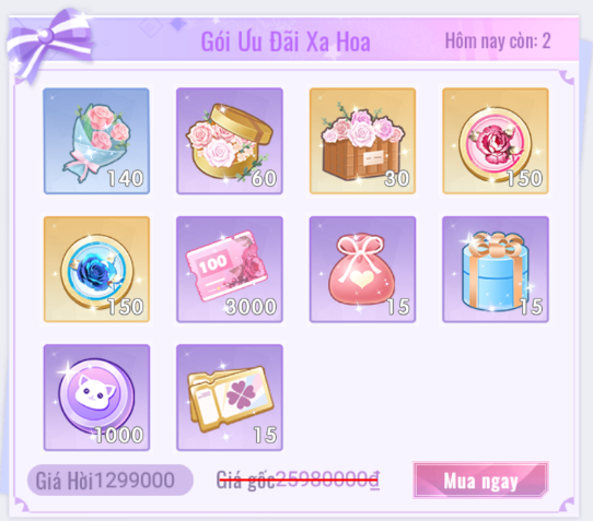 - Không giới hạn lượt mua. 20 [Kim Cương] = 1 [Hộp Hoa Cao Quý].