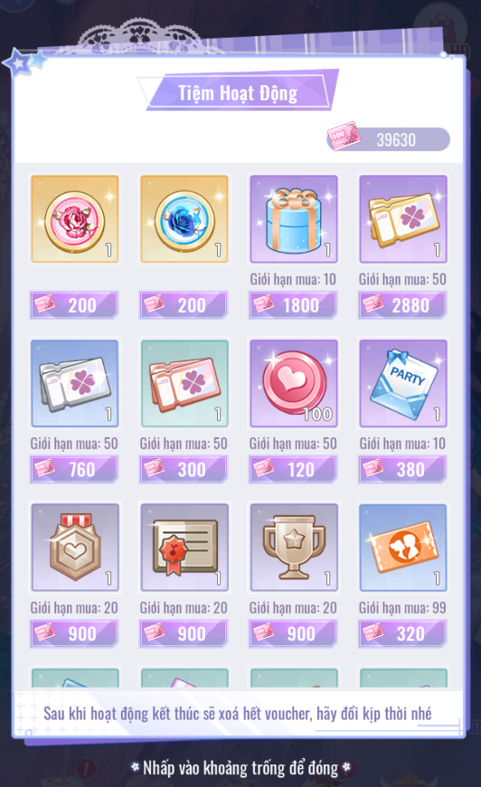 • [Voucher Biển Hoa]: Dùng trong hoạt động Hoa Hồng Và Biển Xanh. Đổi vật phẩm trong Tiệm HĐ.