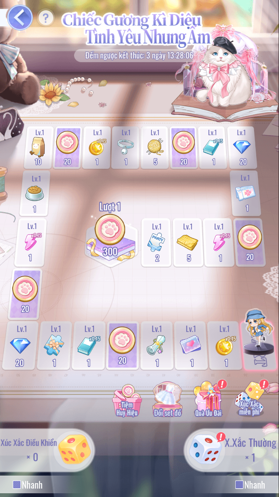 • Vào ô cờ huy hiệu hoặc ô cờ điểm cuối, nhận [Huy Hiệu Mèo Bông], dùng đổi phụ kiện set 5★ kỳ này.