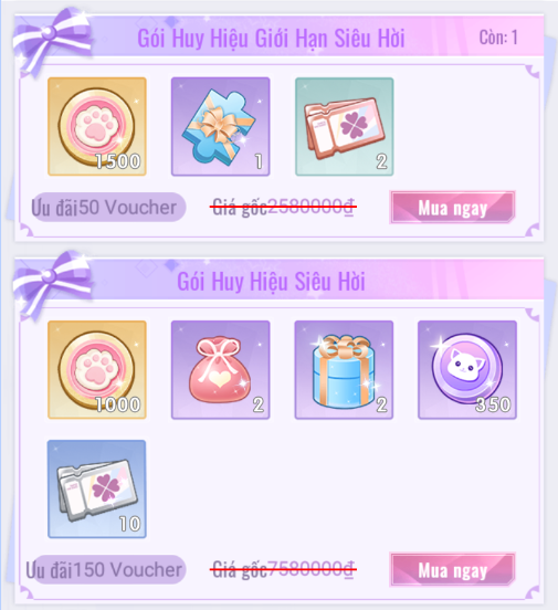 • [Huy Hiệu Mèo Bông]: Dùng để đổi trang phục nữ hoặc tài nguyên trong Tiệm Huy Hiệu.