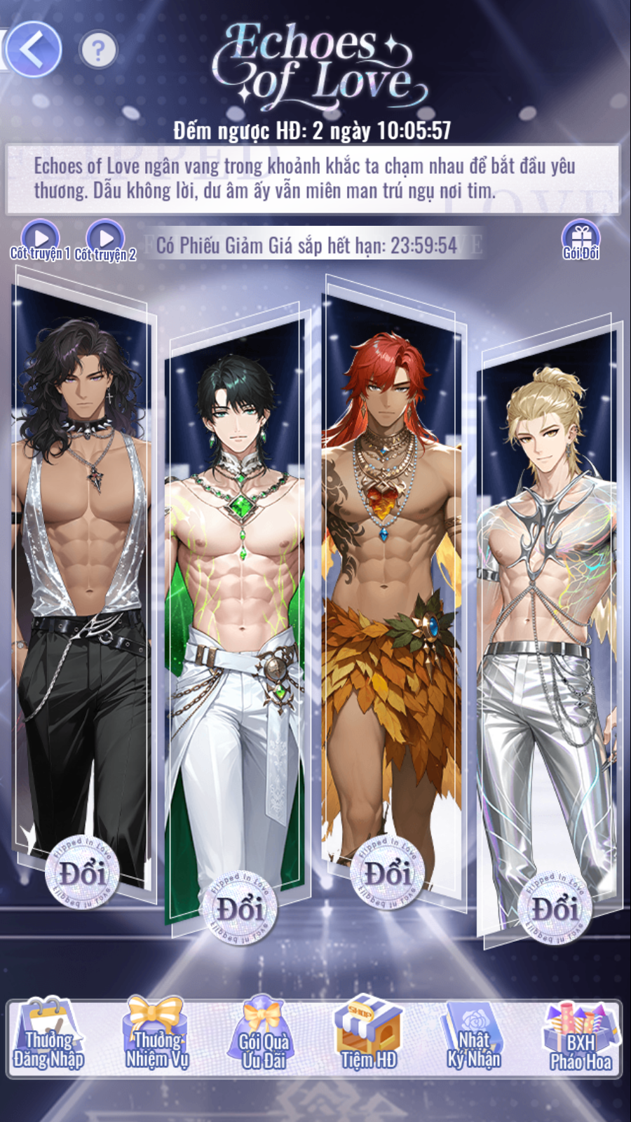 • Trong thời gian diễn ra hoạt động, các Bảo Bối có thể đổi các trang phục chủ đề Echoes Of Love của 4 Tri Kỷ bằng vật phẩm [Huy Hiệu Tình Yêu] và [Voucher Tình Yêu].