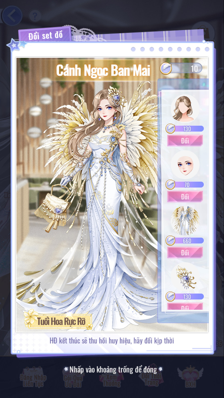 • [Huy Hiệu Cánh Ngọc]: Dùng trong hoạt động Bữa Tiệc Cuối Năm. Đổi trang phục nữ 5★ "Cánh Ngọc Ban Mai".