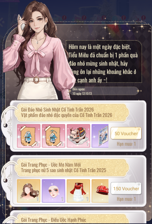 ♦ Mô Tả: Mừng sinh nhật Tri Kỷ Cố Tinh Trần của chúng ta, Boss xin mở bán các gói Sinh Nhật thật hấp dẫn để các Bảo Bối có thể thỏa thích mua sắm trang phục, thẻ bài cũng như trang trí Đảo Nhỏ theo chủ đề chỉ dành riêng cho Cố Tinh Trần thật lung linh nhé!