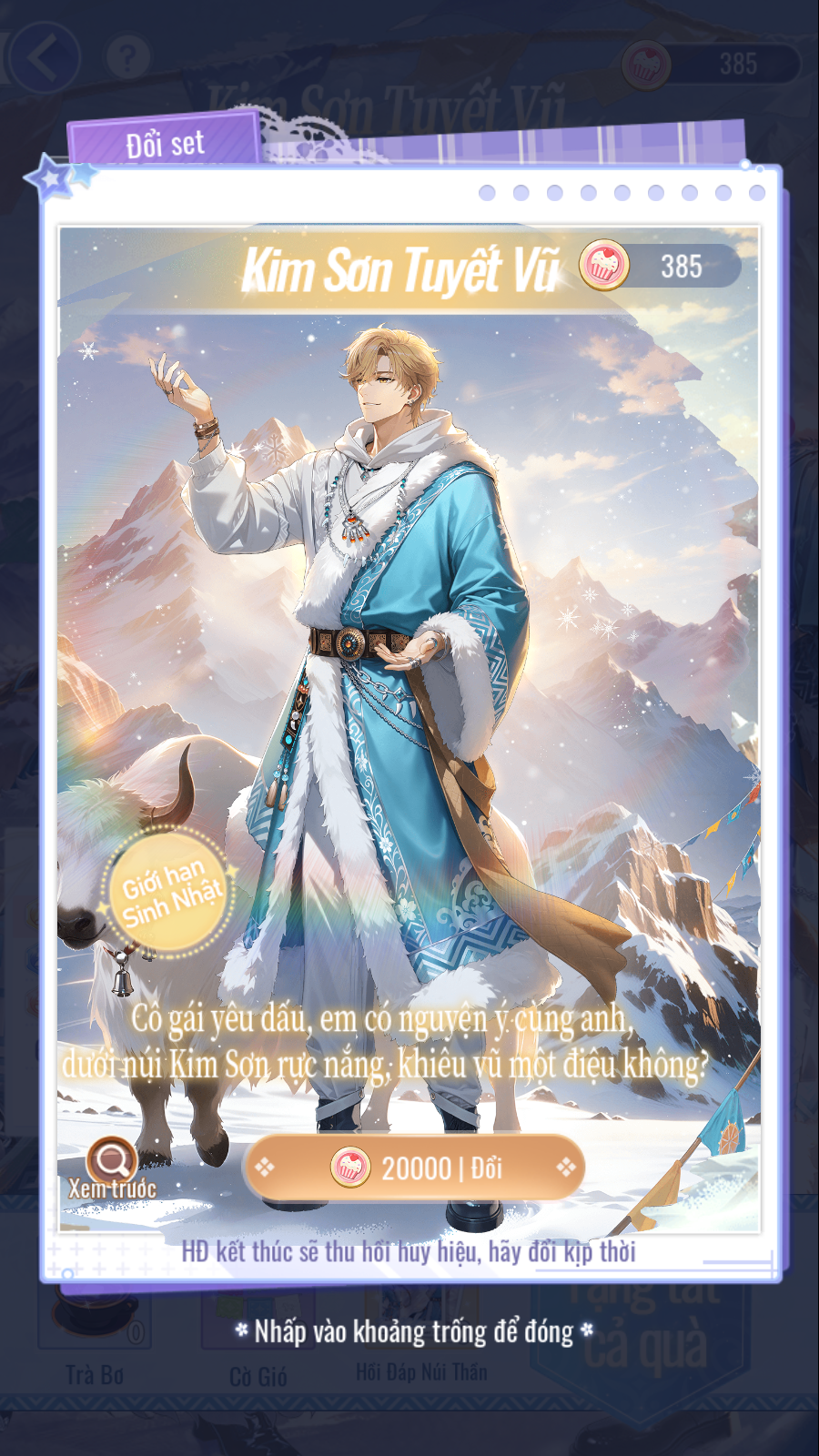 • Dùng [Huy Hiệu Ngọt Ngào] có thể đổi Thẻ giới hạn SSR - Kim Sơn Tuyết Vũ, và 2 trang phục sinh nhật đặc quyền dành riêng cho nữ chính và Cố Tinh Trần. Ngoài ra, [Huy Hiệu Ngọt Ngào] còn có thể đổi đạo cụ sự kiện trong Tiệm Sinh Nhật.