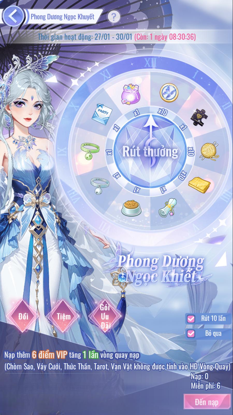 - Đổi Đạo Cụ Hoạt Động. Có thể truy cập tiệm Đạo Cụ Hoạt Động thông qua mục Vào -> Bấm vào vật phẩm sự kiện hiển thị tăng Mị Lực trang phục.