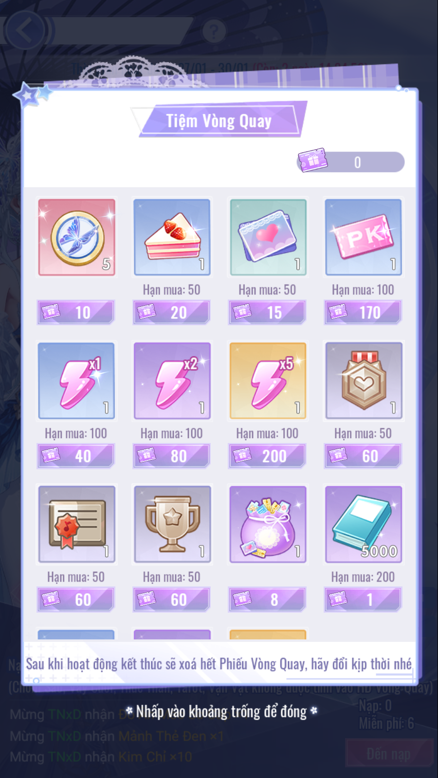 • [Phiếu Vòng Quay]: Đạo cụ đổi dùng trong tiệm hoạt động Vòng Quay. 1 Lần Quay = 10 [Phiếu Vòng Quay] = 5 [Huy Hiệu Ngọc Khuyết].
