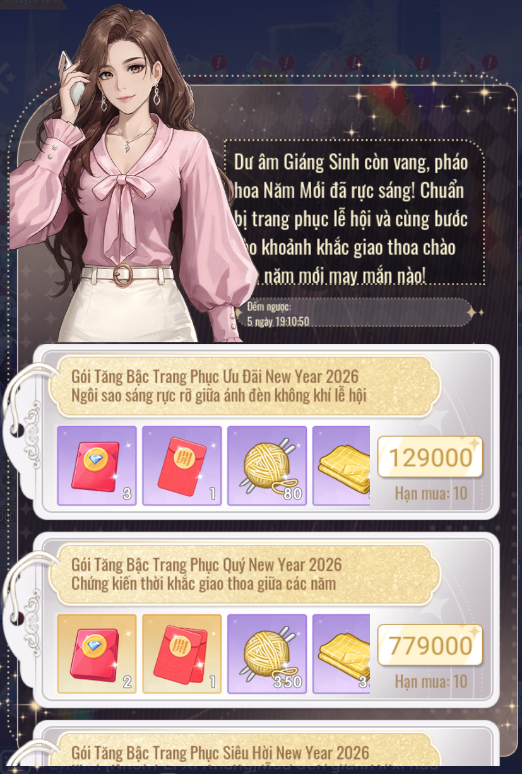 ♦ Mô Tả: Để tăng náo nhiệt cho không khí Năm Mới này, Boss xin mở bán các gói New Year thật hấp dẫn để các Bảo Bối có thể thỏa thích mua sắm trang phục cũng như trang trí Đảo Nhỏ thật lung linh nhé!