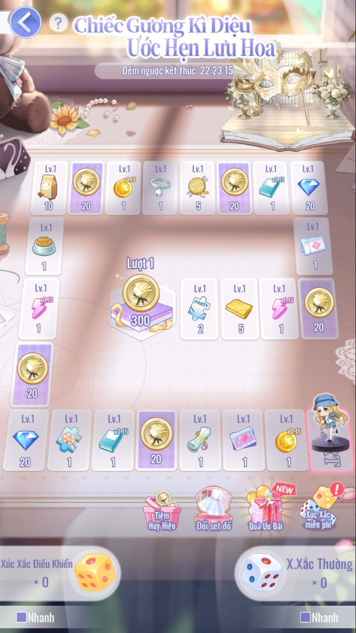 • Mỗi khi đi hết 1 vòng bàn cờ, sẽ nhận được 300 [Huy Hiệu Phù Hoa].