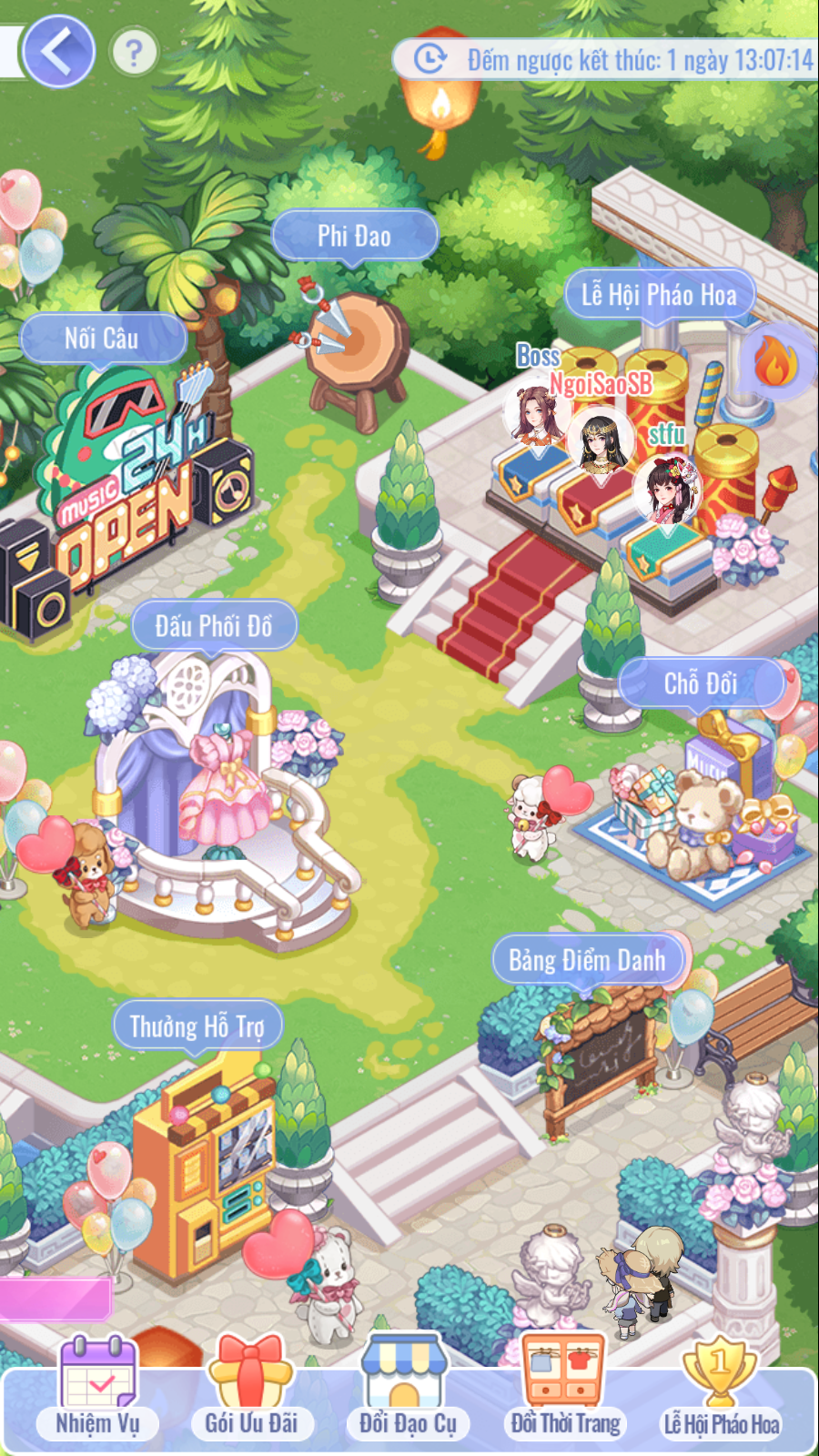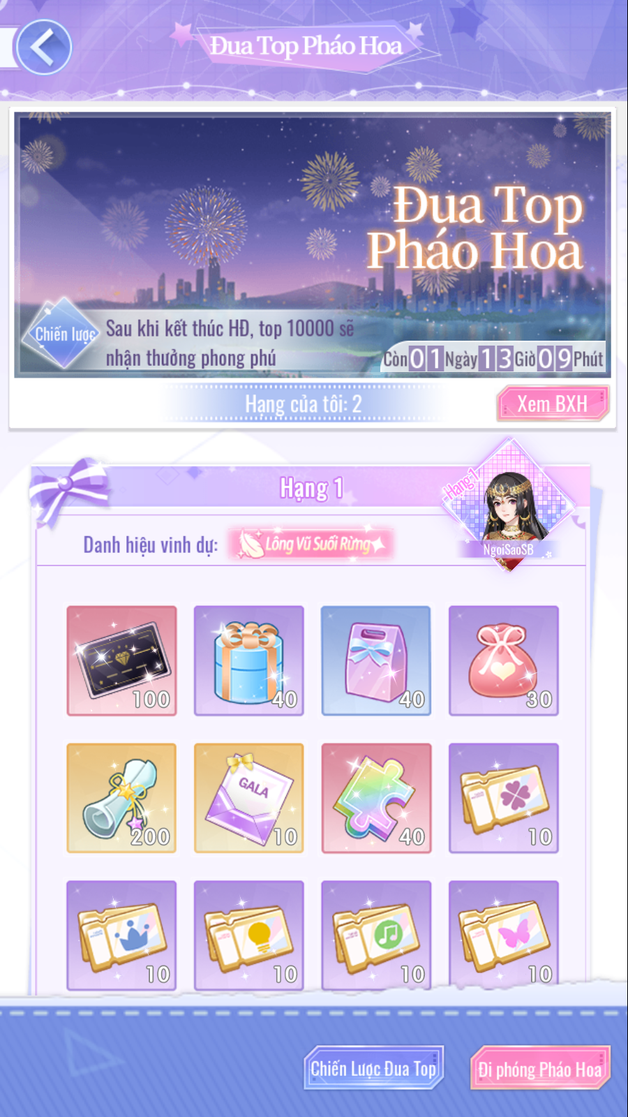 • Pháo Hoa mà các Bảo Bối nhận được ở các quầy hàng, có thể sử dụng tại Lễ Hội Pháo Hoa, đổi thưởng ngẫu nhiên và tính vào Bảng Xếp Hạng, khi Tiệc Sân Vườn kết thúc, Thưởng Hạng sẽ được gửi qua Thư.