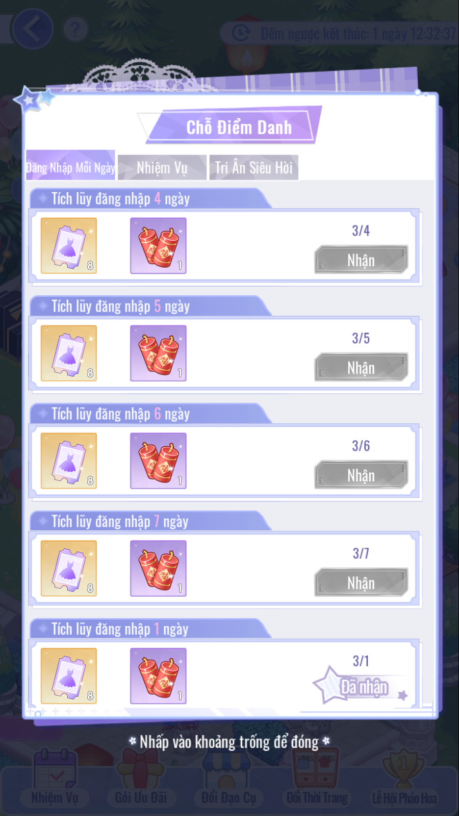- Mỗi ngày nhớ vào [Gói Quà Miễn Phí] để nhận quà và vật phẩm hỗ trợ sự kiện nhé!