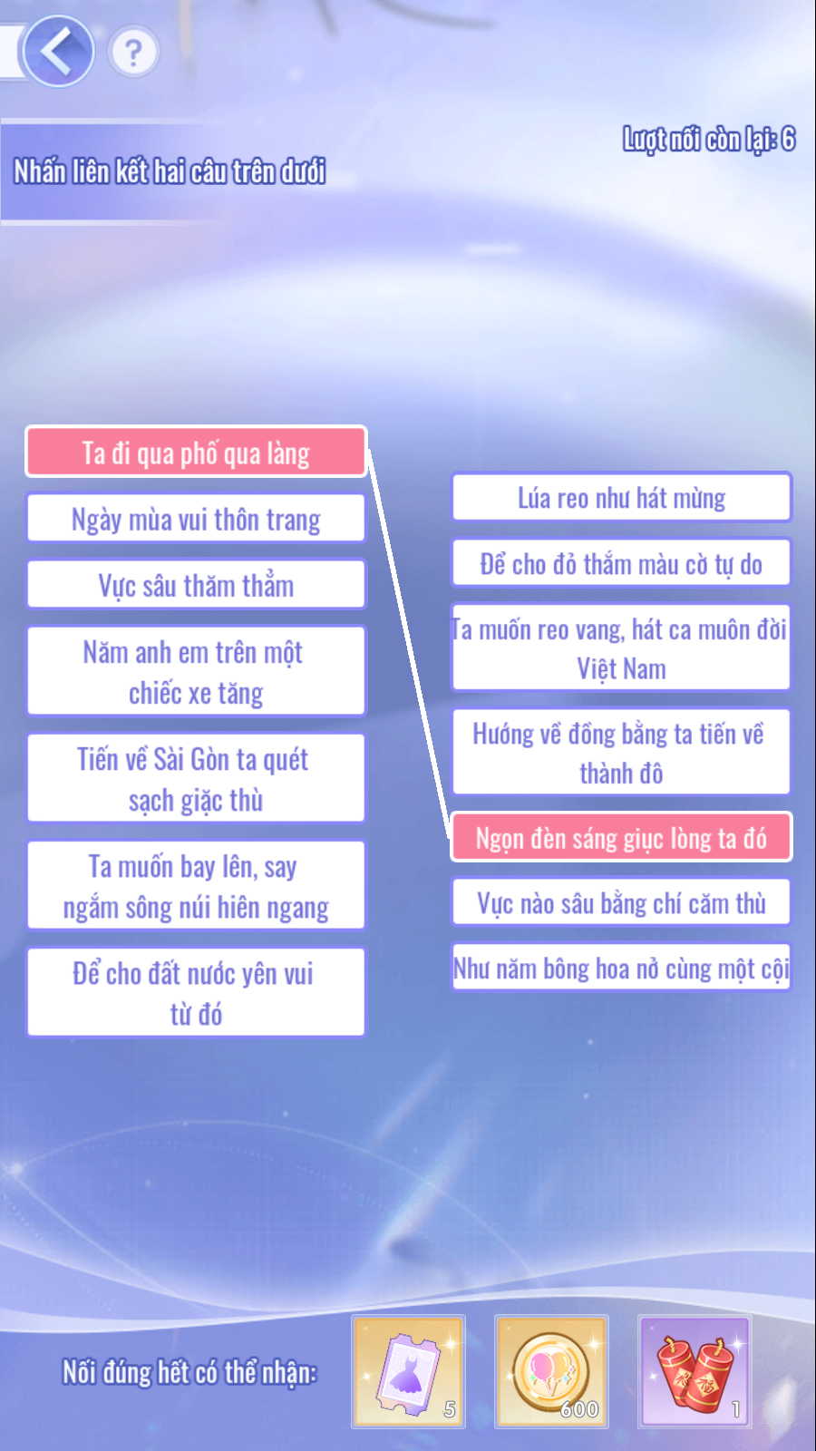 • Nối Câu mỗi ngày sẽ lần lượt đổi một bộ đề, nhấn vào câu bên trái trước, sau đó nhấn vào câu tiếp theo tương ứng ở bên phải lập tức thành công.