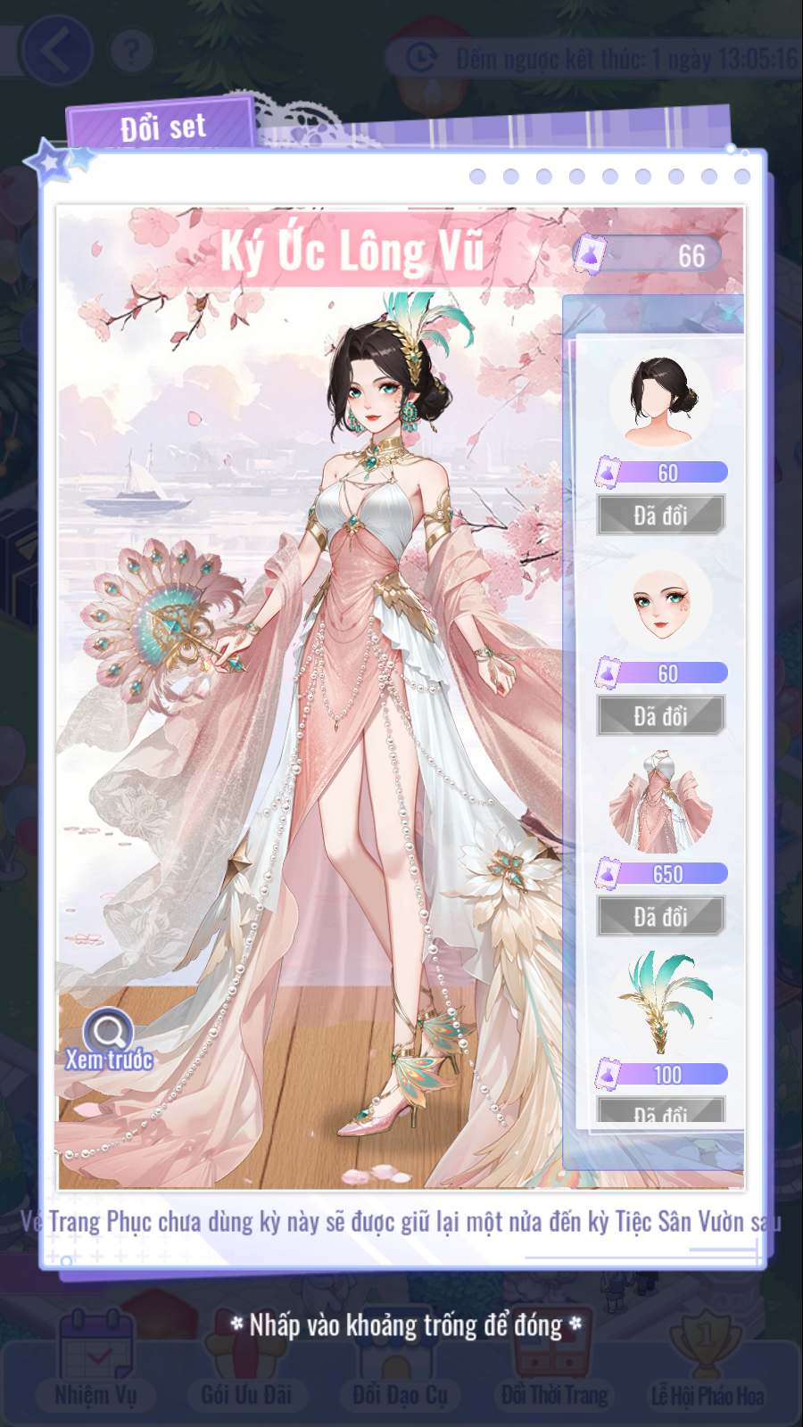 - Trang phục "Ký Ức Lông Vũ": Tổng tiêu hao 1.300 [Vé Trang Phục].