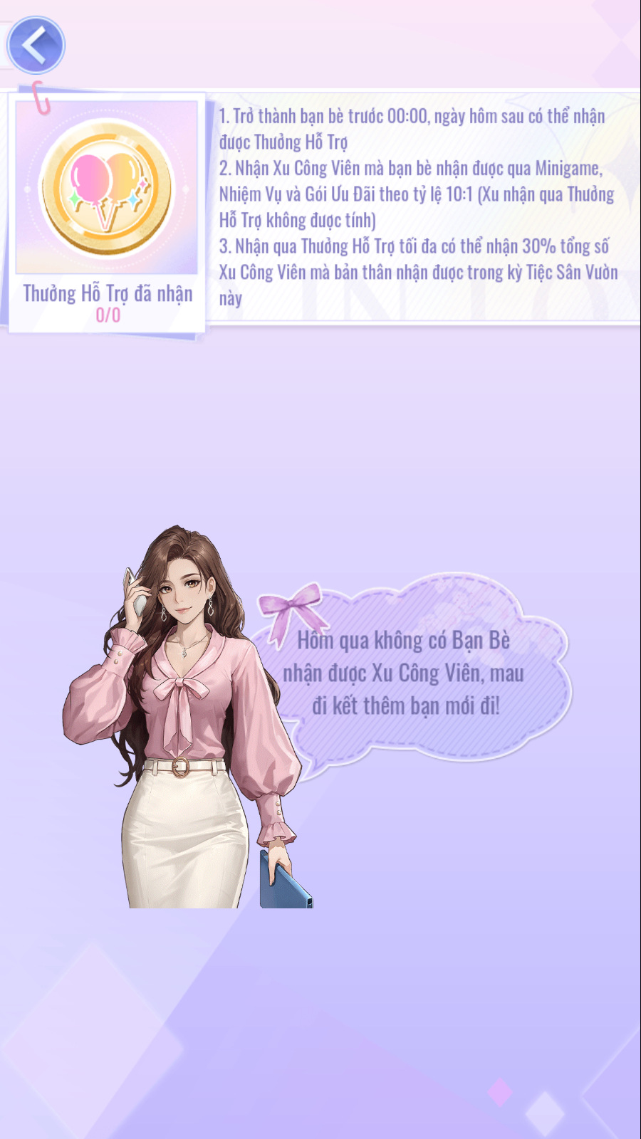 • Nhận qua Thưởng Hỗ Trợ tối đa có thể nhận 30% tổng số [Xu Công Viên] mà bản thân nhận được trong kỳ Tiệc Sân Vườn này.