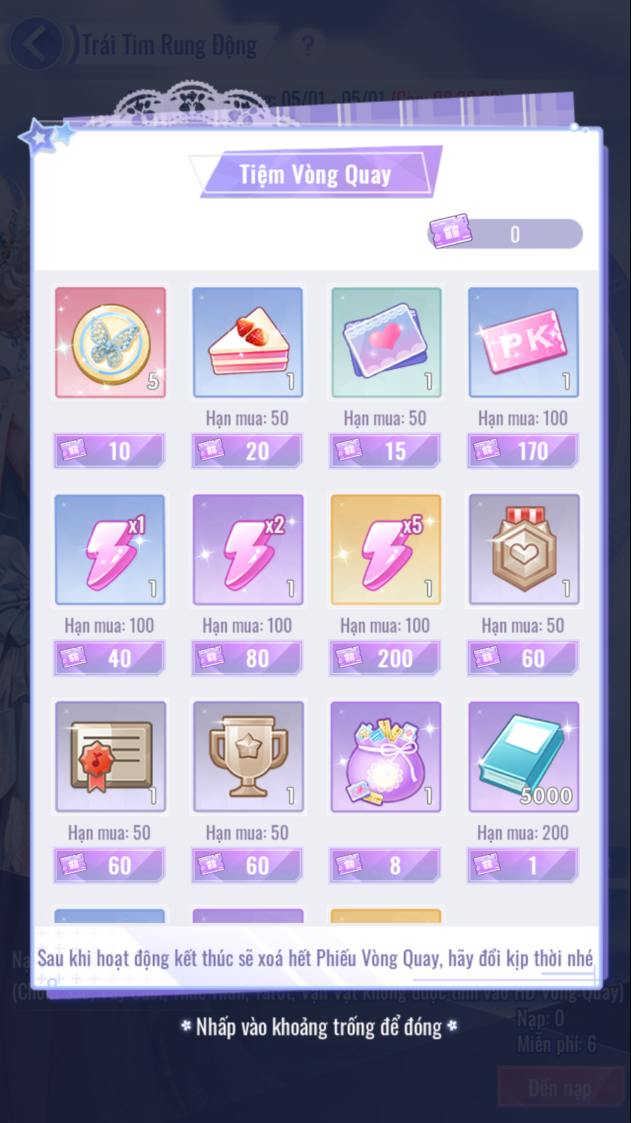 • Trong thời gian hoạt động, mỗi ngày tặng lượt quay miễn phí, mỗi 4 giờ hồi 1 lượt quay miễn phí, giới hạn miễn phí 6 lần.