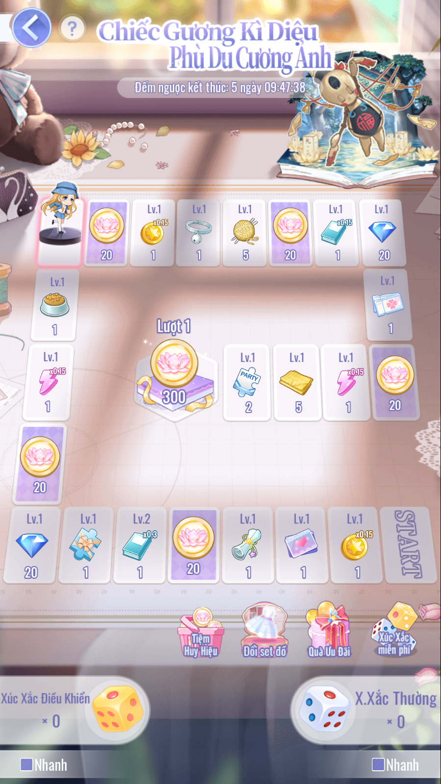 • Mỗi khi đi hết 1 vòng bàn cờ, sẽ nhận được 300 [Huy Hiệu Phù Du].