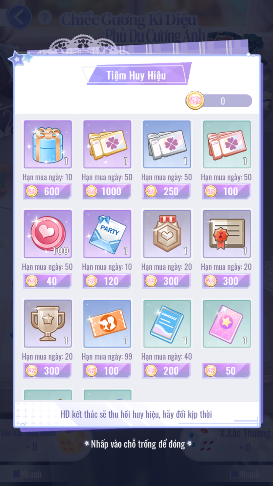 • [Huy Hiệu Phù Du]: Dùng để đổi trang phục nữ hoặc tài nguyên trong Tiệm Huy Hiệu.
