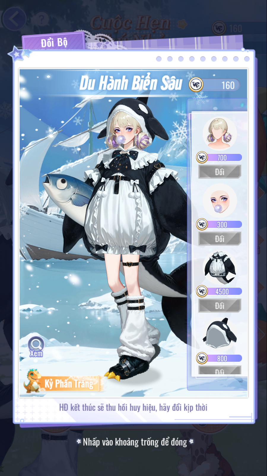 • Để có thể đổi trang phục "Du Hành Biển Sâu", cần vật phẩm [Huy Hiệu Cá Voi]. Có thể nhận được thông qua sử dụng vật phẩm [Hải Đồ].