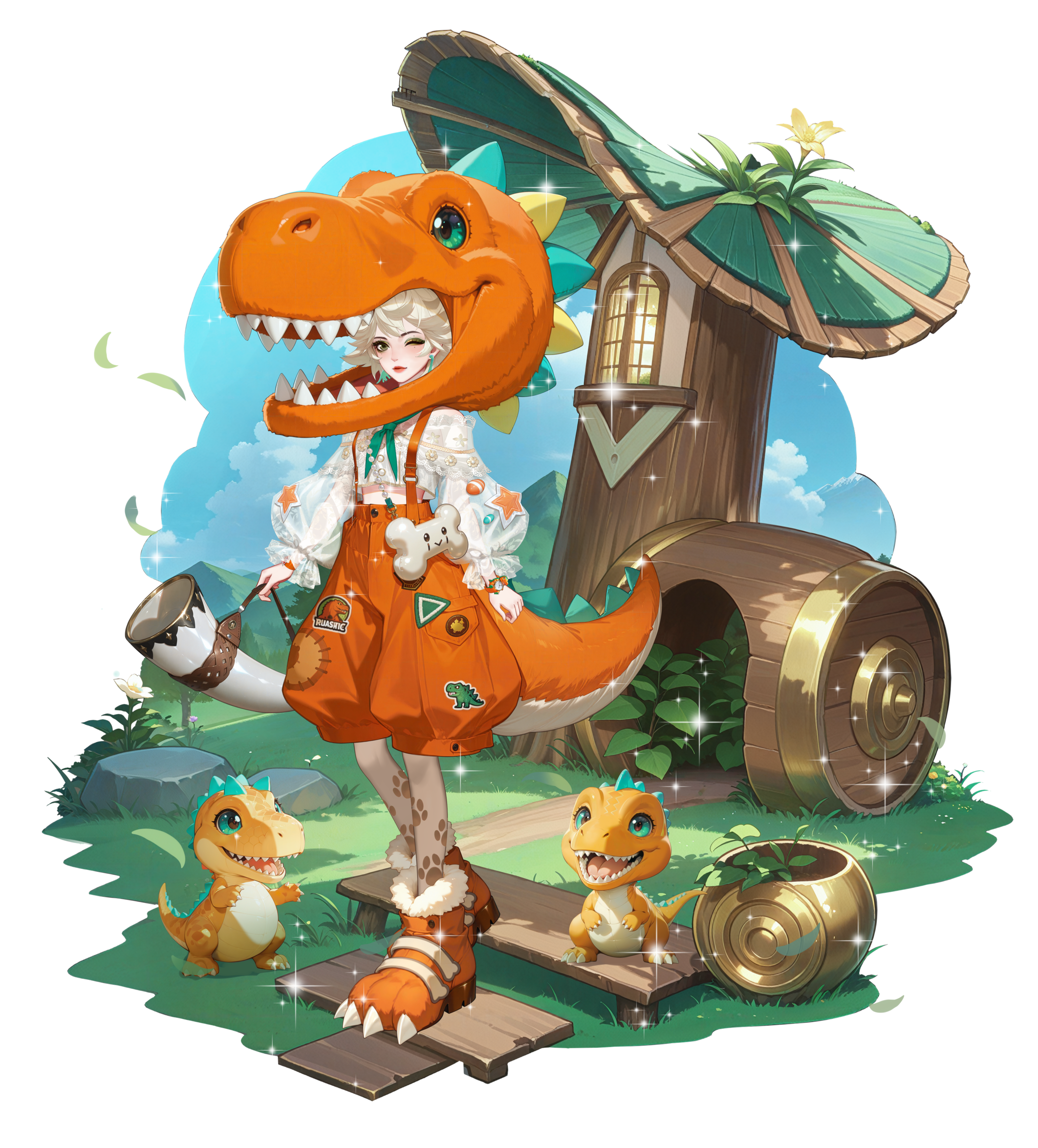 • Để có thể đổi trang phục "Kỷ Phấn Trắng", cần vật phẩm [Huy Hiệu Khủng Long]. Có thể nhận được thông qua sử dụng vật phẩm [Cung Đá].