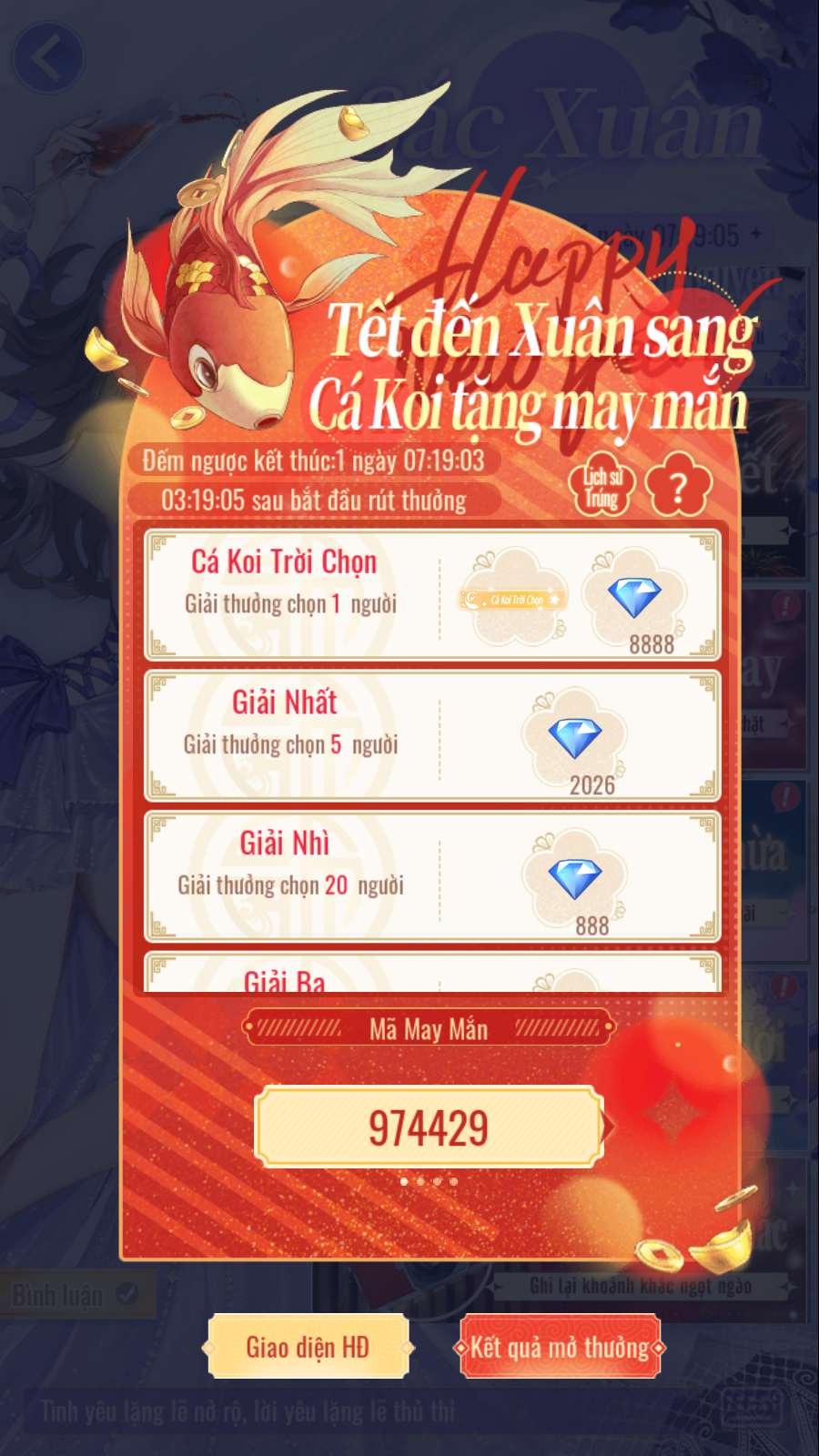 • Mỗi ngày sẽ từ trong các Mã May Mắn đã tạo chọn ra 1 Cá Koi May Mắn, 5 Giải Nhất, 20 Giải Nhì và 50 Giải Ba, những mã khác sẽ đều nhận được Giải May Mắn, chỉ cần tham gia sẽ nhận được thưởng! Nhất định đừng bỏ lỡ nhé.