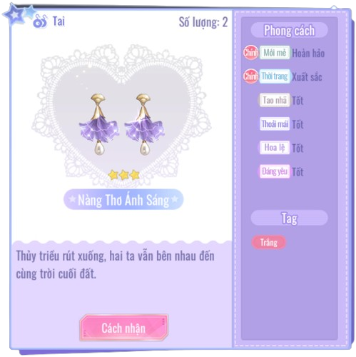 - Phụ kiện khuyên tai 3★ "Nàng Thơ Ánh Sáng": Tiêu hao 1 [Kim Cương].