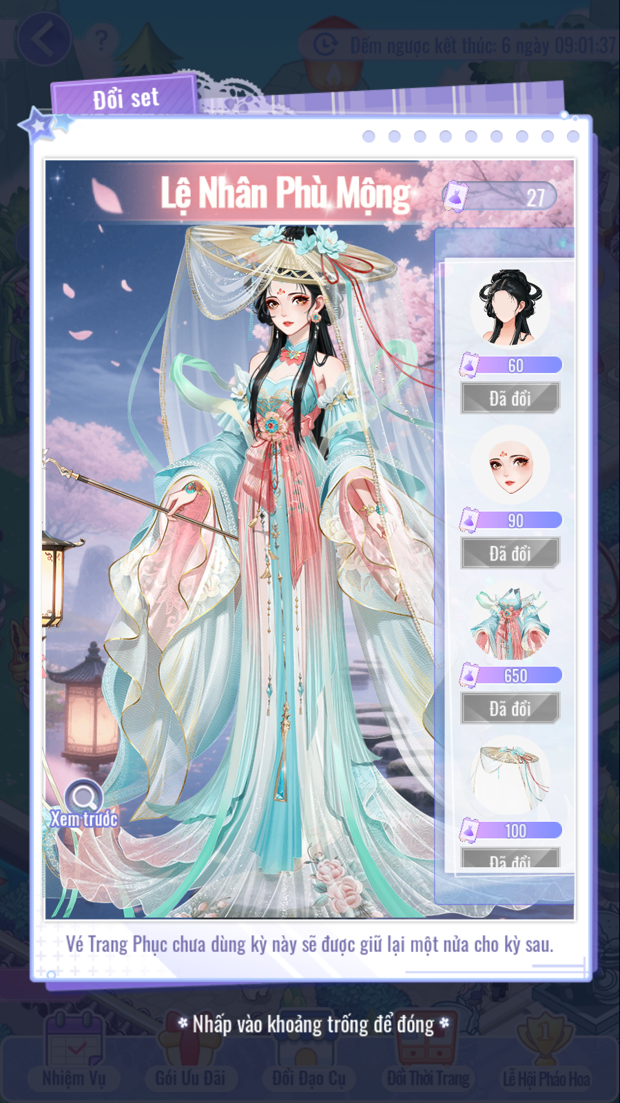 - Trang phục nữ 5★ "Lệ Nhân Phù Mộng": Tổng tiêu hao 1.300 [Vé Trang Phục].