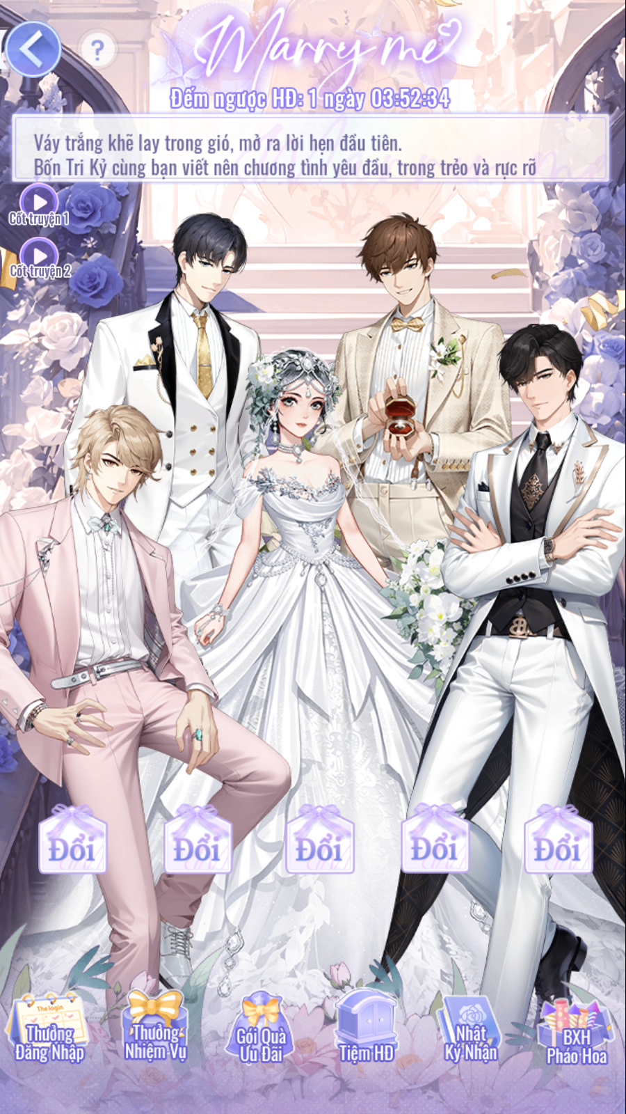 • Trong thời gian diễn ra hoạt động, các Bảo Bối có thể đổi set Đám Cưới của 4 vị Tri Kỷ và Nữ Chính bằng vật phẩm [Huy Hiệu Thề Ước] và [Voucher Đám Cưới].