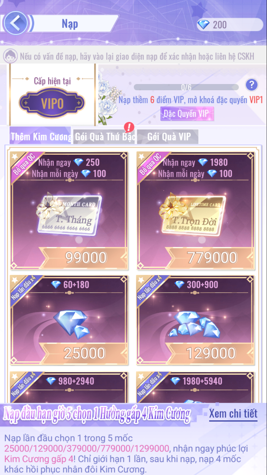 - Gói thẻ tháng: Dành cho Bảo Bối muốn trải nghiệm cảm giác nhận Kim Cương hoàn trả mỗi ngày với tỉ lệ lên tới 3250%!