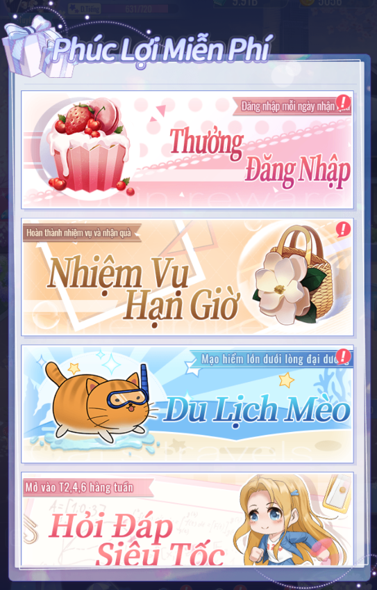 - Mỗi ngày đăng nhập và tham gia trò chơi để hoàn thành nhiệm vụ, nhận phần thưởng đạo cụ.