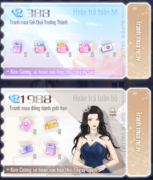 - Gói 388 Kim Cương: Sau khi mua Kim Cương sẽ được hoàn trả toàn bộ vào hộp thư trong vòng 3 ngày sau
