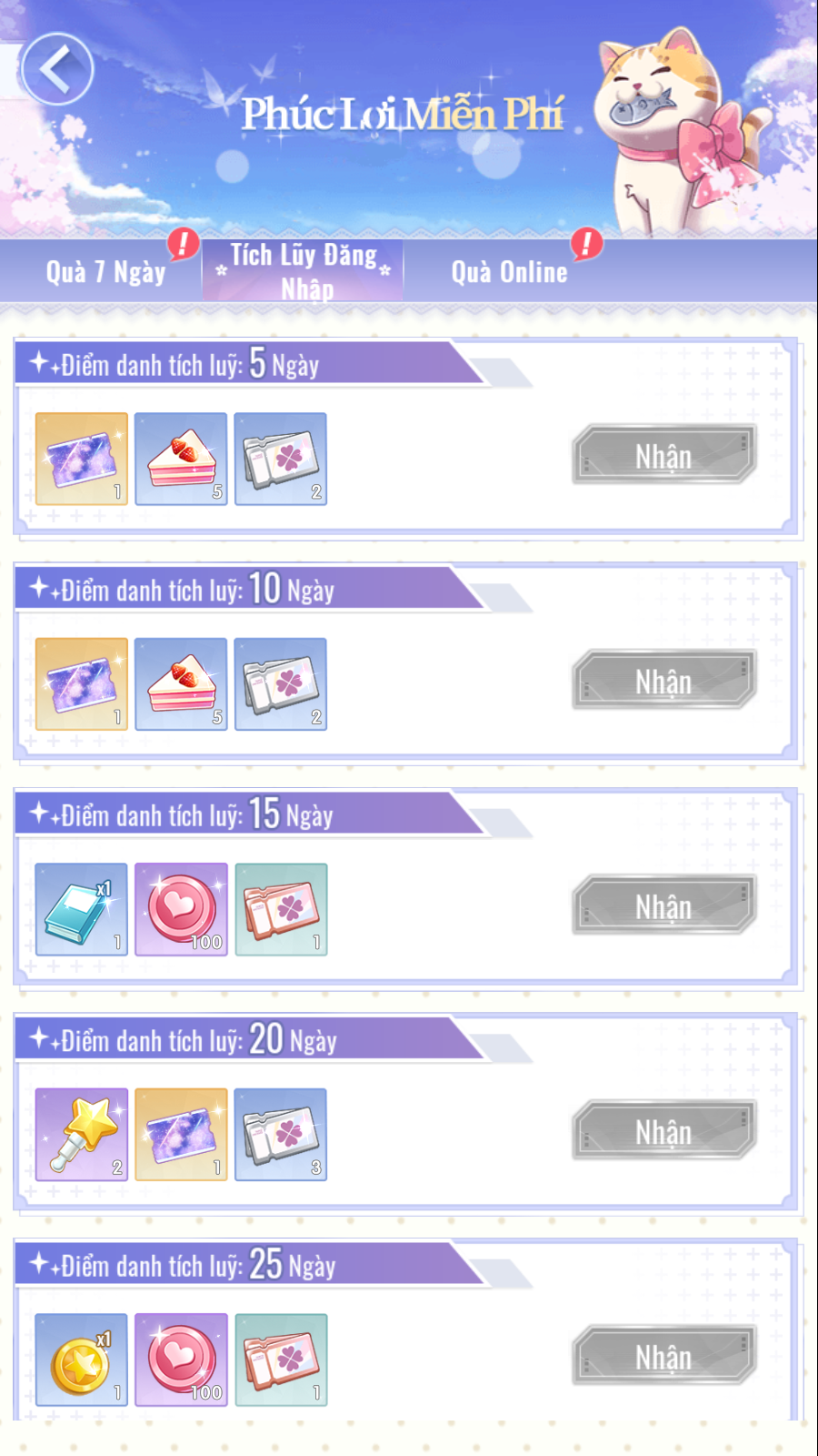 - Tích Lũy Đăng Nhập: Được chia thành nhiều mốc khác nhau theo cấp độ tăng dần, điểm danh đủ mốc để nhận phần thưởng đạo cụ giá trị