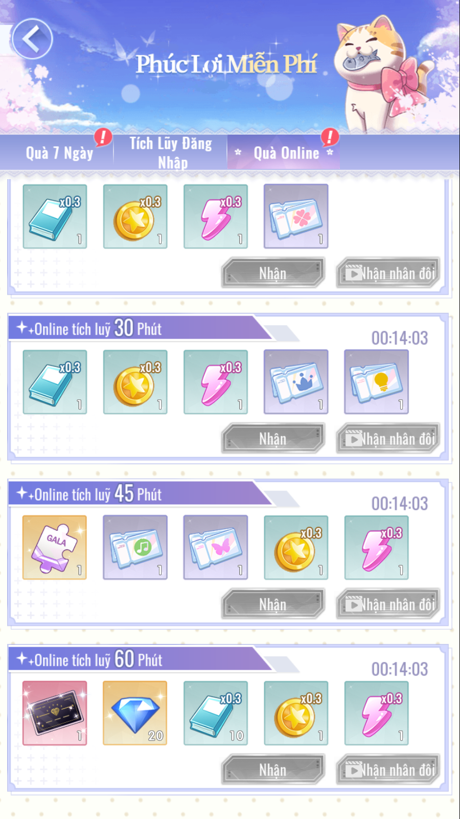 - Quà Online: Tính theo số phút Bảo Bối trực tuyến trên game tối đa 60 phút, đạt đủ điều kiện hãy mau đến nhận thưởng nhé Bảo Bối !!!