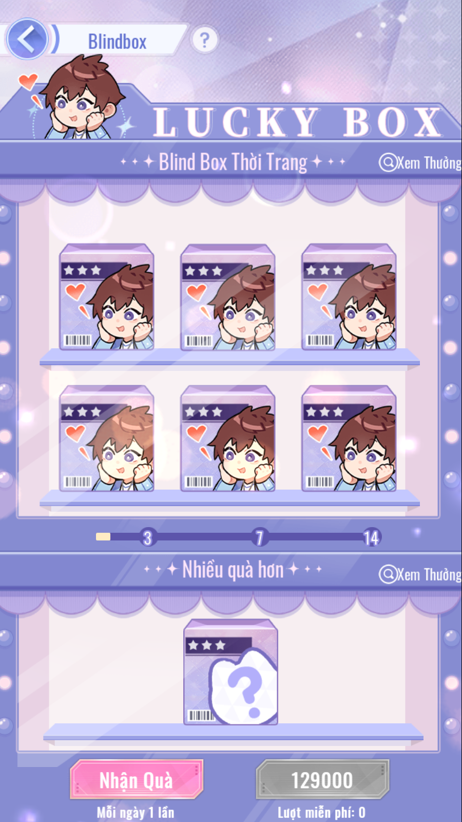 • Đăng nhập vào các ngày thứ 3/7/14, nhận được 1 lần rút Blind Box Thời Trang miễn phí, ngoài ra các Bảo Bối vẫn có thể mua thêm lượt rút nếu muốn.