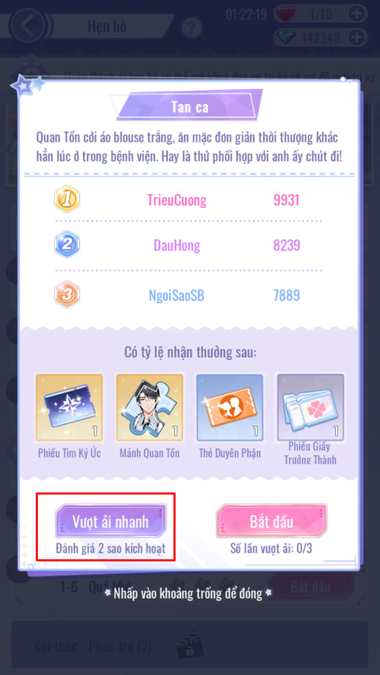 - Để có thể dùng tính năng Vượt Ải Nhanh, các ải Hẹn Hò đã tham gia phải đạt từ 2 Sao trở lên nhé các Bảo Bối thân yêu !!!