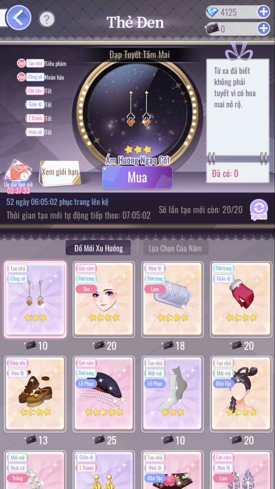 • Mỗi 60 ngày sẽ có các trang phục mới trong Đồ Mới Xu Hướng. Có thể xem danh sách đồ trong mục Xem Giới Hạn.